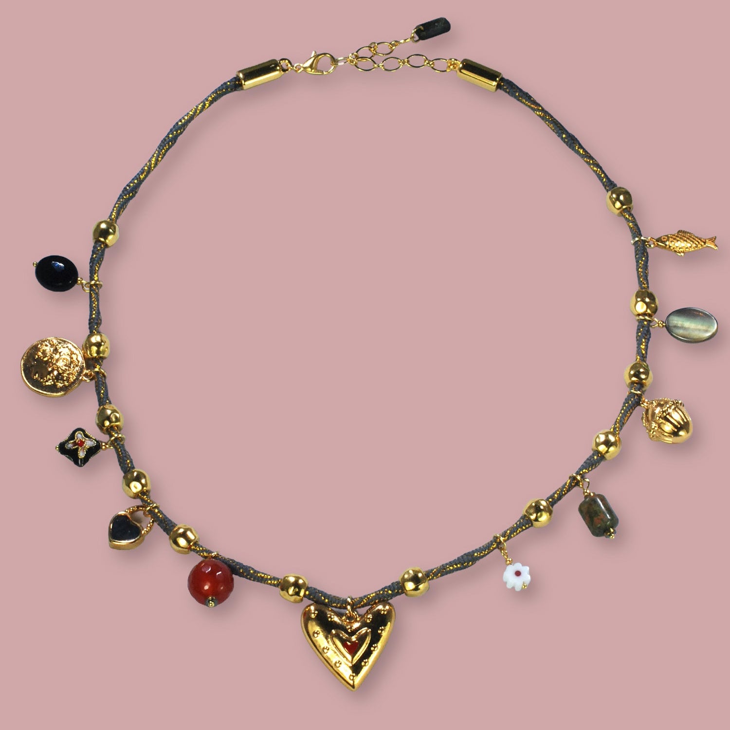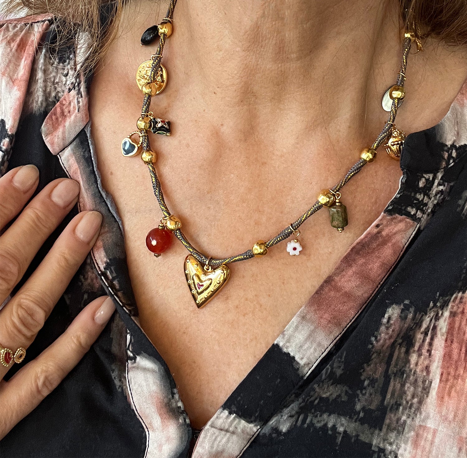 Kette am Seil mit vergoldeten Anhängern, Halbedelsteinen und Glasperlen. Diese Halsketten sind wirklich einzigartig, keine zwei Halsketten sind gleich.
