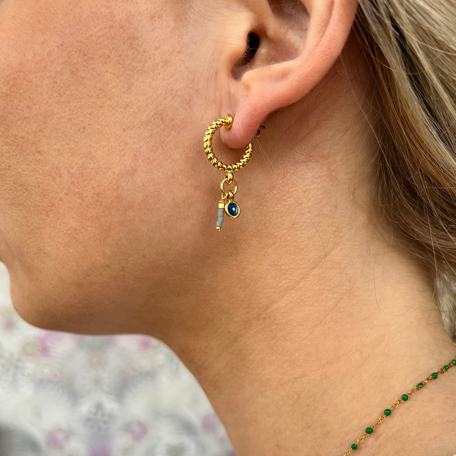 Kleine creolen oorbellen met Japanse glaskralen met bedel. De oorbellen hebben ronde haakjes en zijn van verguld brons. De lengte is ± 25 mm.
