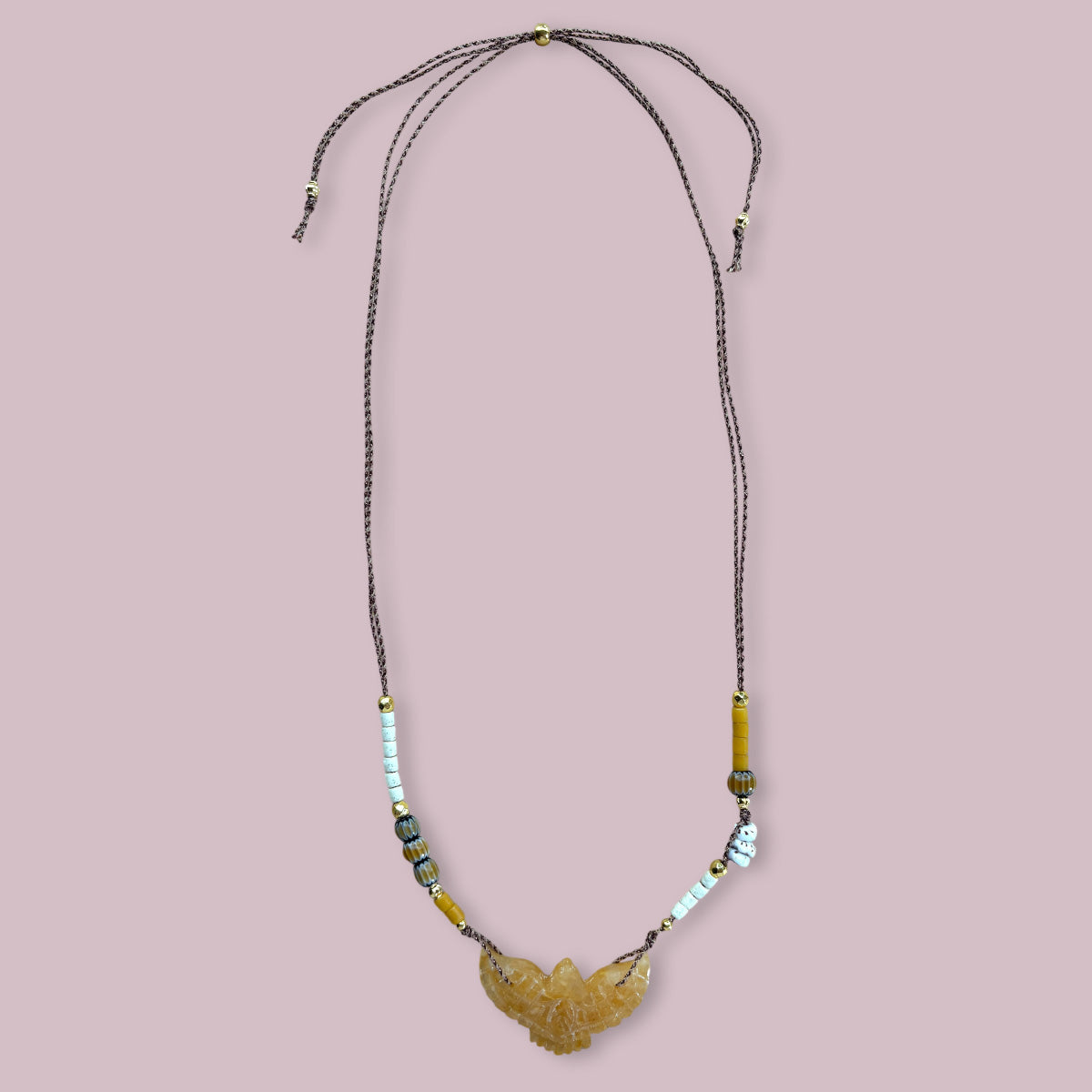 Voeg een vleugje zomer toe aan je look met deze handgemaakte ketting in frisse kleuren. Een speelse mix van kleine kraaltjes met een hanger in een vorm van een vogel/adelaar.
