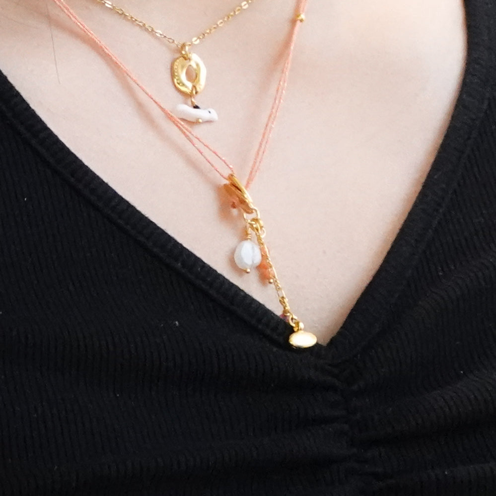 Diese Halskette hat einen unkonventionellen und eleganten Look. Es besteht aus einer fein geflochtenen braunen Kordel mit kleinen Goldperlen, die dezent über die Länge verteilt sind. Der Anhänger besticht durch mehrere bezaubernde Details, darunter eine goldfarbene Muschel, eine kleine Süßwasserperle, eine Perlmuttperle und afrikanische Glasperlen in Weiß- und Rosatönen. Der Materialmix verleiht der Kette einen verspielten und edlen Charakter. Perfekt für einen sommerlich-schicken Look!