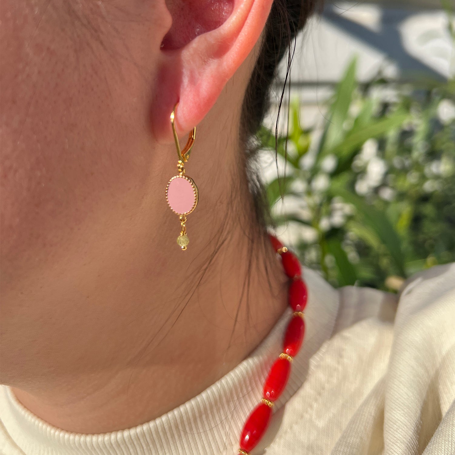 Dieser elegante Ohrring hat ein goldfarbenes Finish mit drei dekorativen Elementen: einer Amazonitperle, einem ovalen Anhänger mit hellrosa facettiertem Glas und einem Peridot an der Unterseite. Die Kombination aus Farben und Materialien verleiht dem Ohrring einen schicken und verspielten Look.