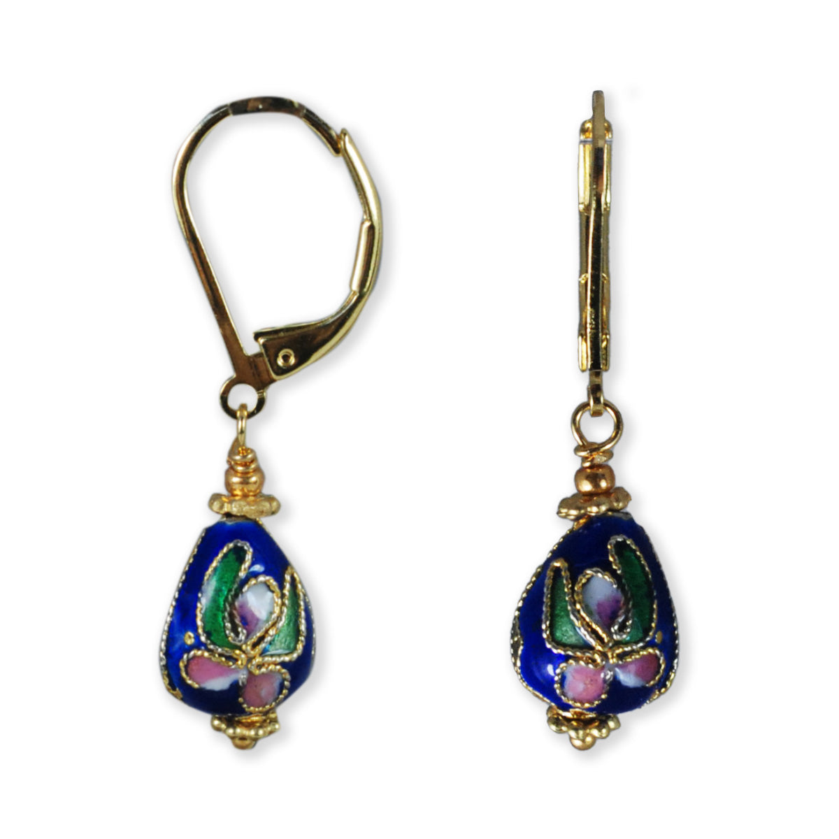 Dieser wunderschöne Ohrring hat einen zeitlosen und eleganten Look. Die Basis bildet ein vergoldeter Ohrring mit einem raffinierten Anhänger. Der Anhänger besteht aus einer königsblauen, eiförmigen Perle mit einem kunstvollen Cloisonné-Finish. Die Perle weist zarte Blumenmotive mit grünen Blättern und rosa Blütenblättern auf, umrahmt von goldenen Details. Die Goldoberfläche auf der Ober- und Unterseite der Perle verleiht ihr einen besonders luxuriösen Touch.