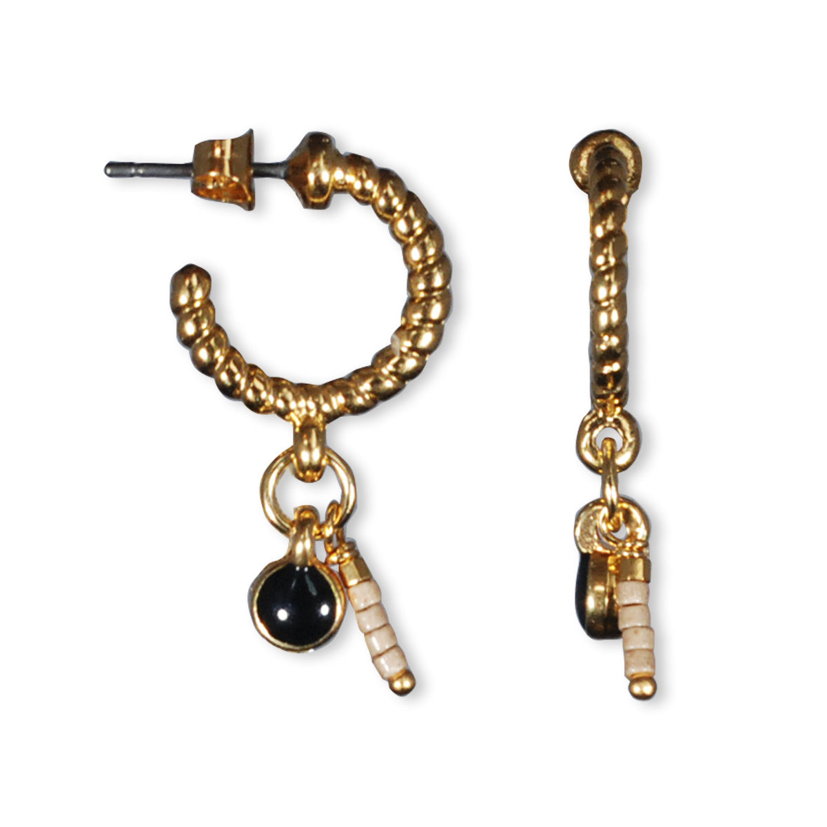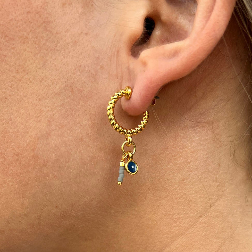 Kleine Creolen mit Halbedelsteinen und Anhänger. Ohrringe mit runden Haken, Bronze, vergoldet. Länge ± 25 mm