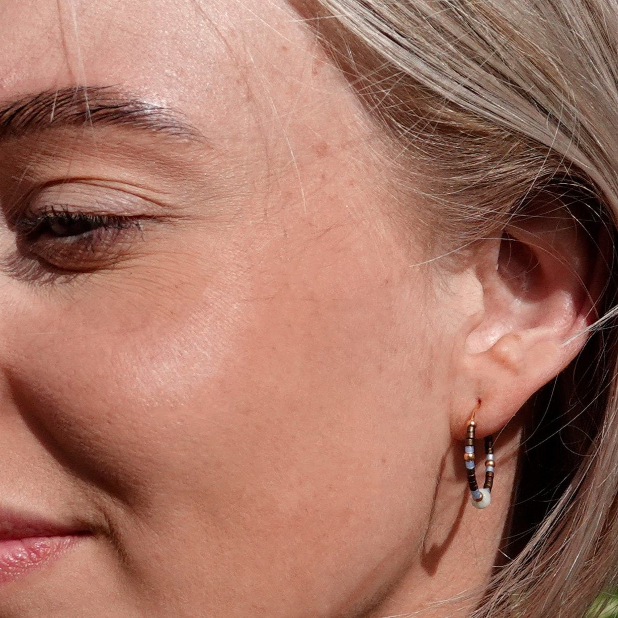 Vergoldete Ohrringe, Creolen in dezenten Farben. Glasperlen und Halbedelsteine. ø 20 mm