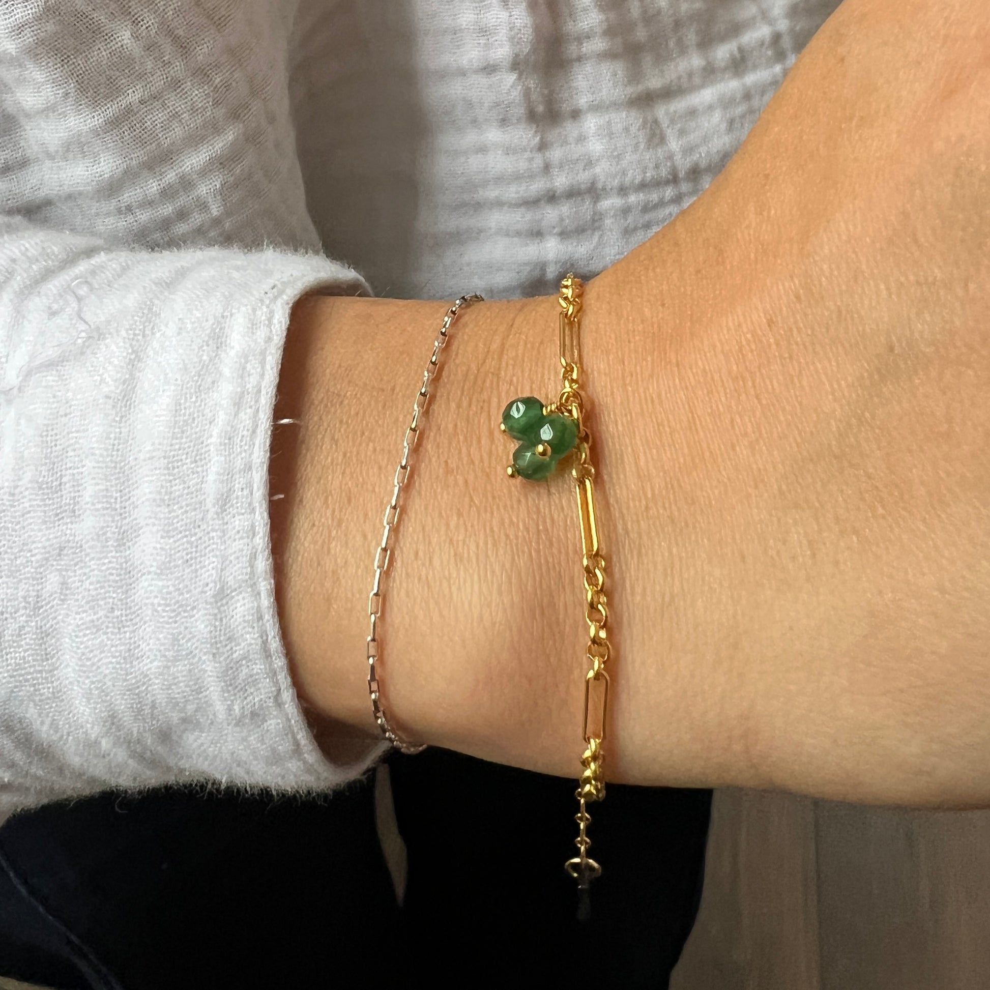 These earrings have an elegant and refined look. They consist of a gold plated ear hook. Three faceted strawberry quartz beads hang from it. In addition, a small square amazonite bead.
