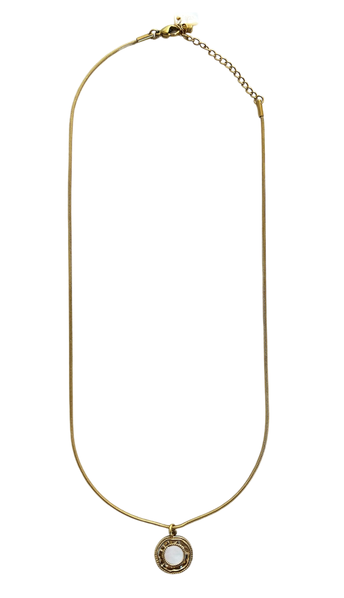 Zeer subtiele ketting, type snake chain, van stainless steel. Met een hanger ingelegd met parelmoer. Gold plated en een lengte van 40-45 cm