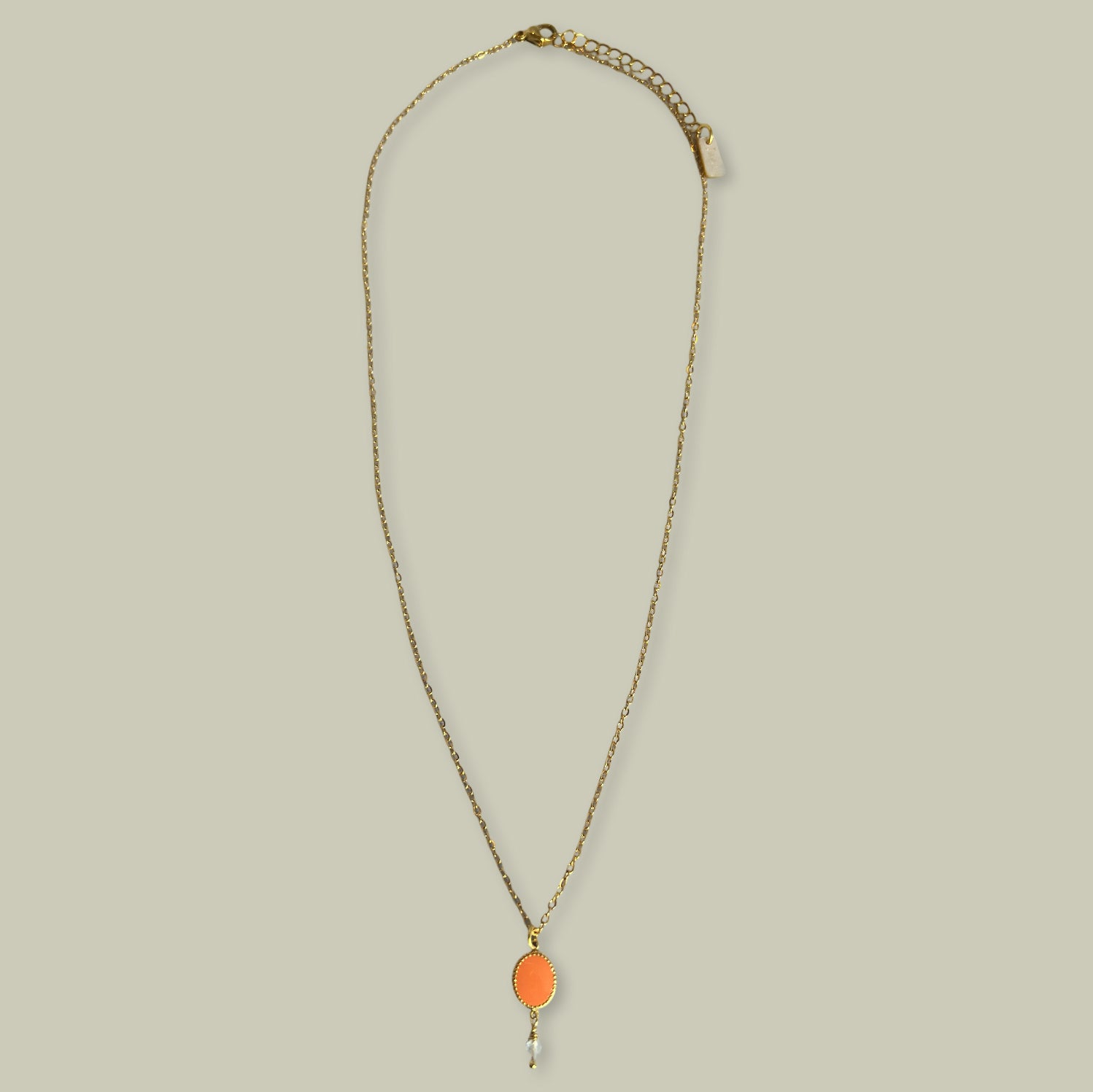 Deze fijne ketting heeft een ovale emaille hanger met daaronder een klein semi-precious steentje. Minimalistisch, vrouwelijk en perfect om solo te dragen of te combineren.
