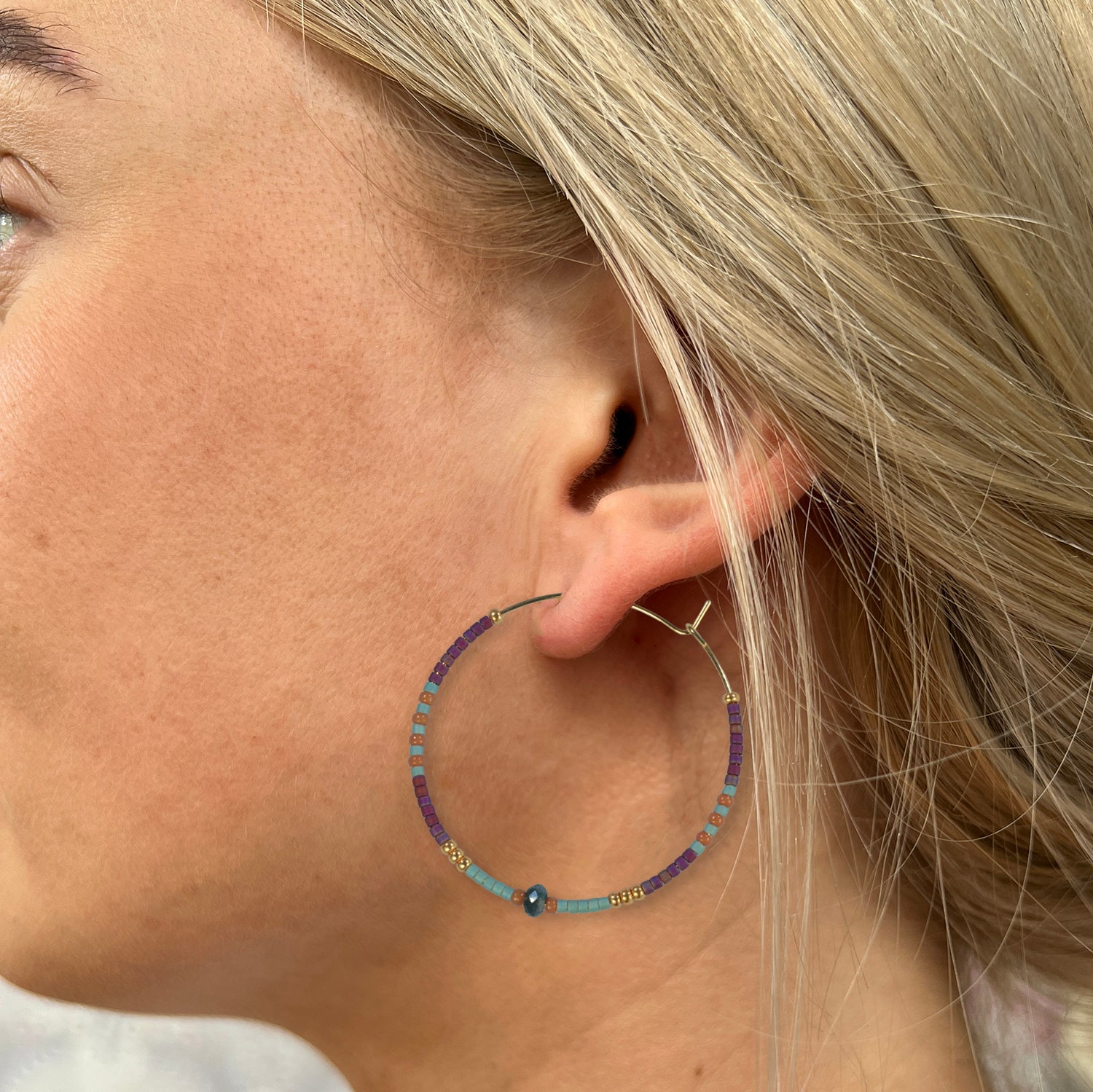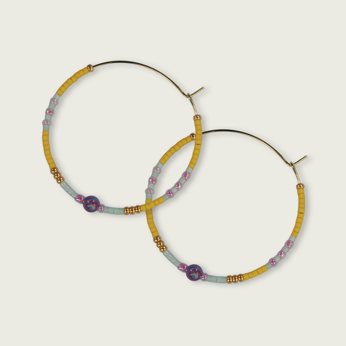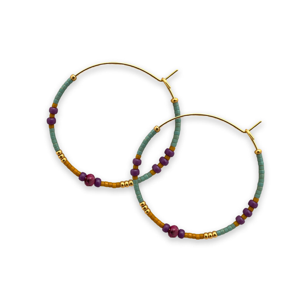 Stijlvolle, handgeregen creool met gekleurde kralen en subtiele goudaccenten. De oorbel heeft een speelse maar elegante uitstraling en is perfect om elke outfit een frisse touch te geven. Verkrijgbaar in verschillende kleuren. Glas kraaltjes, semi-precious steentjes en goldplated ringen.
